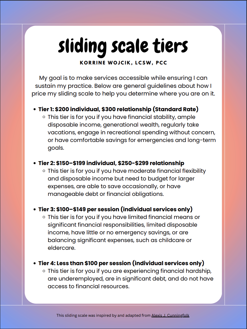 I hold openings for people who have limited financial resources. No proof of income is required. I trust you will choose the tier that aligns best with your needs. Please contact me to confirm the sliding scale availability, as some tiers may have a waitlist. To view a larger version of the sliding scale handout, click on the image.