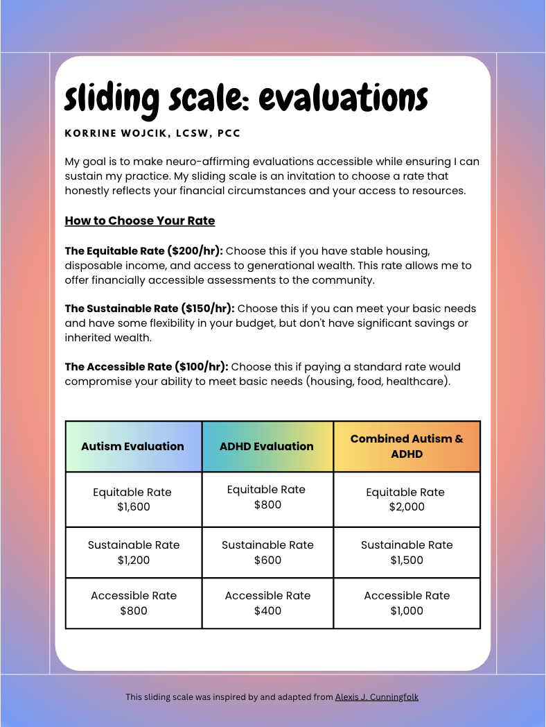I also hold sliding scale openings for evaluations. No proof of income is required, and I trust you to choose the tier that fits your situation. Because evaluation spots are limited, please contact me to confirm availability before selecting a tier.